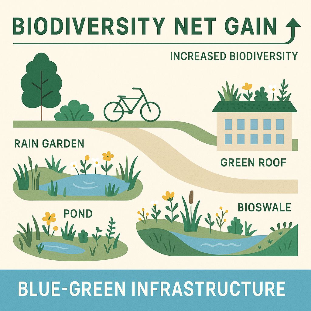 The Natural England Green Infrastructure Framework recognises the value of blue infrastructure, noting that water features can contribute significantly to BNG scores, carbon capture, climate adaptation and public wellbeing, a rare convergence of goals.