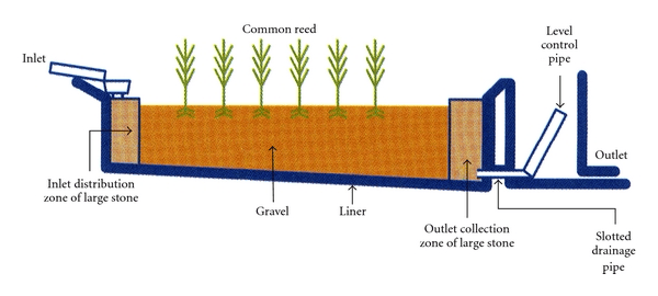 Simplified layout of a tertiary treatment reed-bed shown is the simplified layout of a tertiary treatment reed-bed is shown, where wastewater enters at the inlet, is cleaned in the reed-bed area through filtration and absorption of nutrients by the reeds, and released at the outlet into rivers and streams, hence the location of the reed-bed alongside flowing water. Source is Severn Trent Water