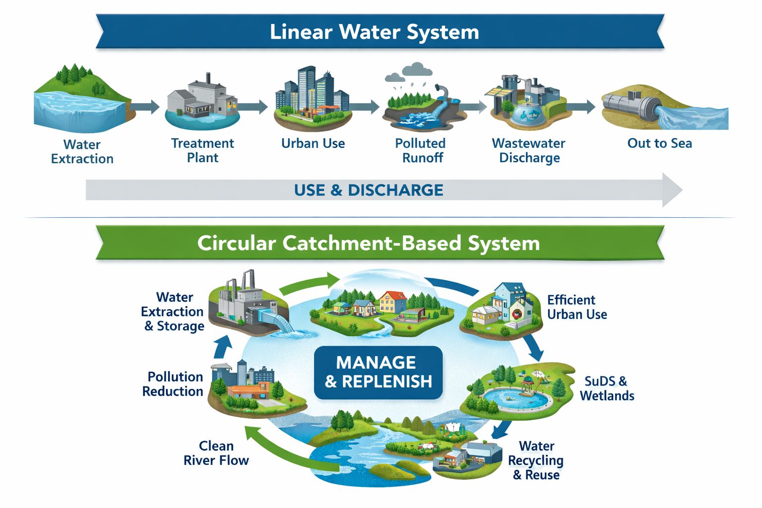 Water management: linear vs circular systems
